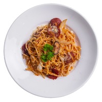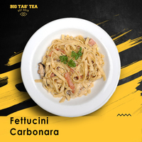 Fettucini pasta cooked with carbonara sauce and served with salami slices