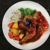 Double Whole leg roasted chicken served with sauteed vegetables, coleslaw with brown gravy.