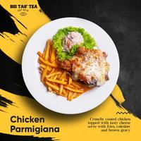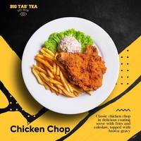 Classic chicken chop in delicious coating served with fries and coleslaw, topped with brown gravy.