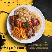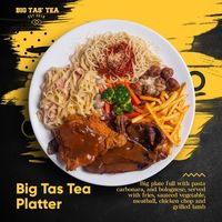 Big plate full with pasta carbonara and bolognese, served with fries, sauteed vegetables, meatball, chicken chop and grilled lamb.