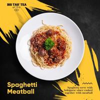 Spaghetti served with bolognese sauce and cooked with meatballs.