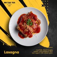 Baked lasagna stuffed with beef bolognese and topped with tomato paste.