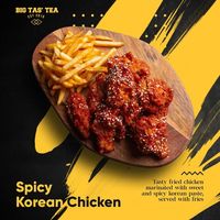 Tasty fried chicken marinated with sweet and spicy Korean paste, served with fries.